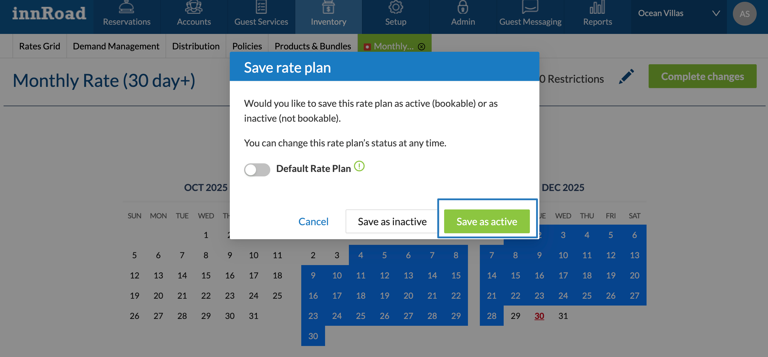 - Set the Rate Plan to Active to start selling teh rate, or Inactive to save without