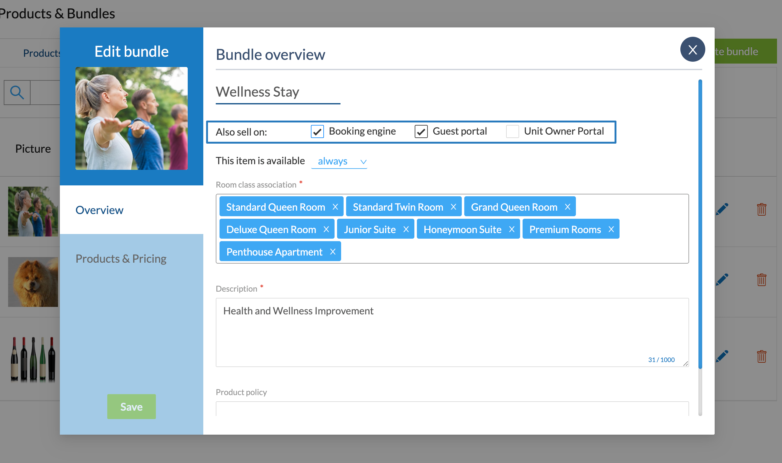 • Set whether the Bundle is available for all room classes or only specific room classes.